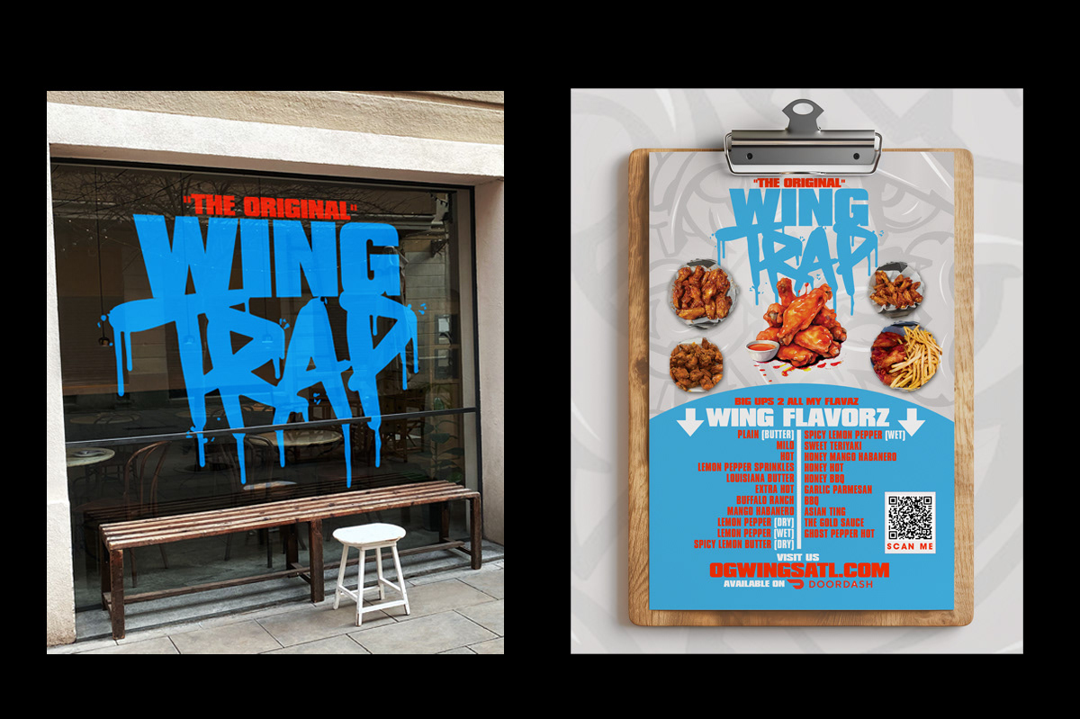 Wing Trap is a restaurant based in Atlanta, Georgia. I was commissioned to create a brand identity that stands out from the crowd, that can also be used on merchandise. Along with this the client also required print ready menus to advertise their availability on platforms such as Doordash.